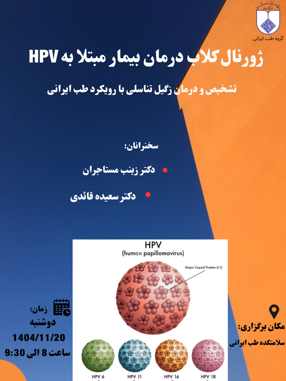 عناوین جلسه : برگزاری جلسه ژورنال کلاب درمان بیمار مبتلا به HPV، تشخیص و درمان زگیل تناسلی با رویکرد طب ایرانی